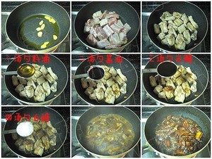 放入排骨,一直煸炒到排骨變色后,表面金黃微焦